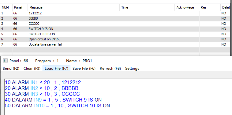 - The Acknowledge, Res(et) & Delete functions work as described, but they are not as useful as they could (easily) be. Having the red/brown/green flash persist until the alarm line is Deleted means that there is no distinction between old/cleared alarms and new alarms.
