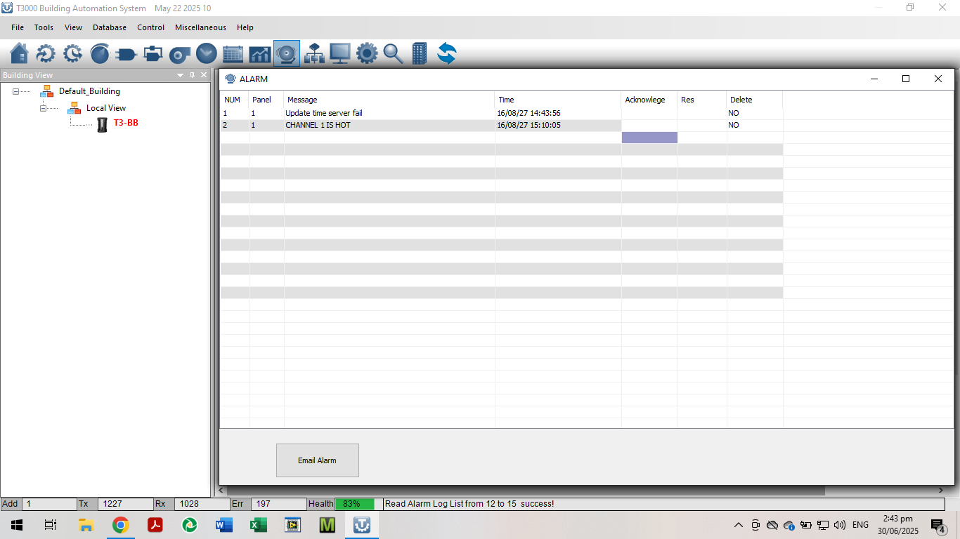 - Within T3, the only way to Acknowledge any alarm is by clicking on Alarm Log screen (there is no ACK function).