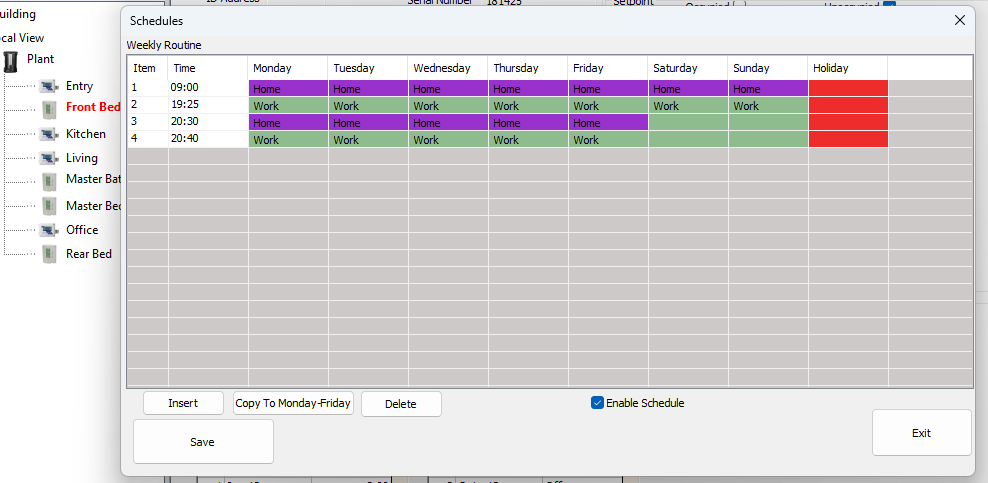 All my hardware is the same REV22 18.05.04. 1 of 4 will allow buttons on 11.4 or 11.5. 4 of 4 allow buttons on 8.9 or 9.0. I have found no combination that the schedule works correctly. They either will not go into unoccupied or will not return from unoccupied. When this happens the icons on the Stat do not match the information on T3000. I have also seen the stat to go a mode where it says the setpoint is 999. then usually goes back to a normal mode after a short period. If that gives us any clues.
