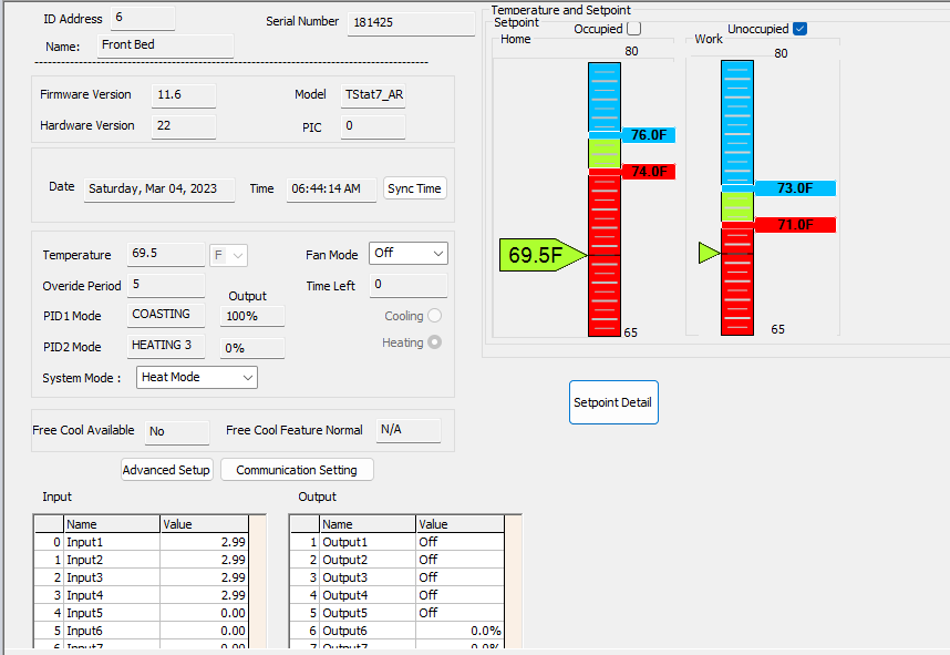 Things look good. I was able to get the stats to go into and out of unoccupied with the override timer set at 0. Still one stat working correctly and the others with buttons inoperable. But they all followed the schedule and outputs followed the PID table in Occupied and Unoccupied. I set the override time back to 60 and now I see once the unoccupied time was to start, the override timer started counting down. Once the timer ran out the stats went into Unoccupied. Looks like it all works with one glitch to resolve. The override timer is getting triggered at the transition to unoccupied.