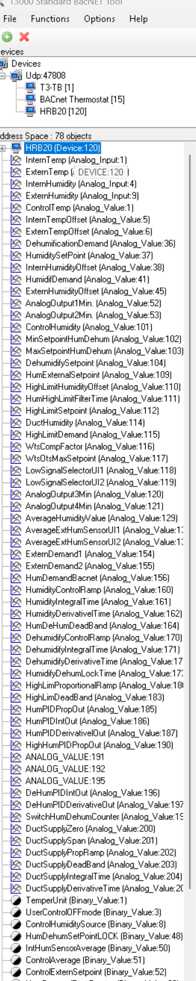 I have a TB-8i with a Neptronic HROB20 humidity controller on MSTP MAC 20, with an instance ID of 120, and a Contemporary Controls BAST-221C-B2 Thermostat on MSTP MAC 15 and a instance ID of 15. Port is at 38400 on all devices, comms are good: