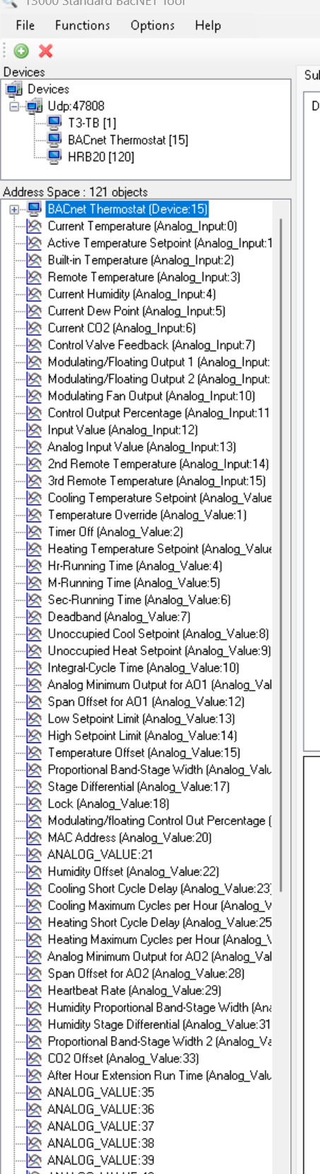 The Thermostat on the other hand will NOT show up under the device tree in T3000, and while I can send and poll using YABE launched from the T3000 application, But the YABE on my laptop on the same subnet (Windows 11, YABE version 2.10) can SEE the devices, but the WhoIS fails every time. Also, the variables do not update reliably.