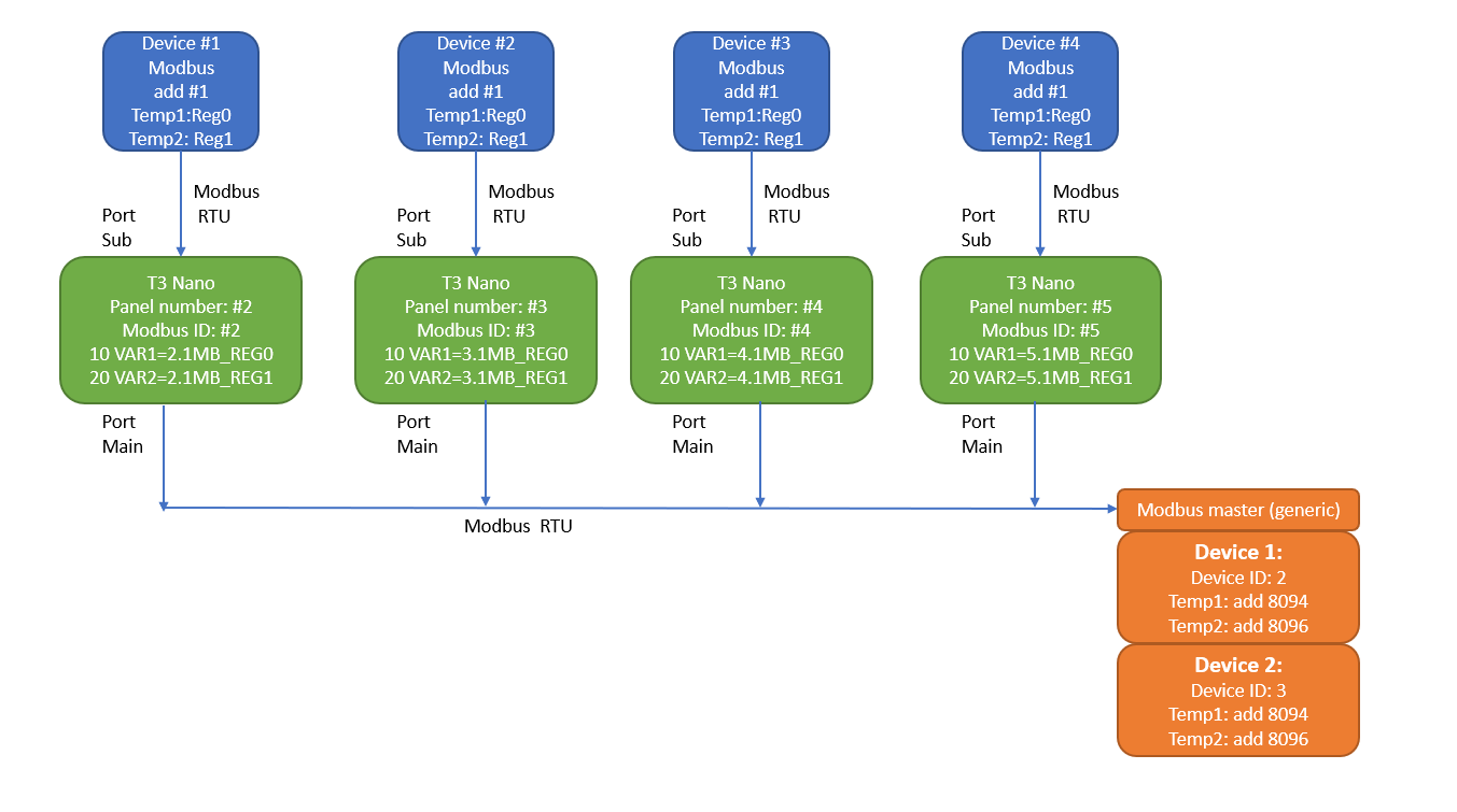 The master system (PLC, SCADA, etc.) would then communicate with each T3-Nano using its unique address on the “main” bus, and each T3-Nano would forward the requests to its local slave device (always address 1) via the “sub” port.