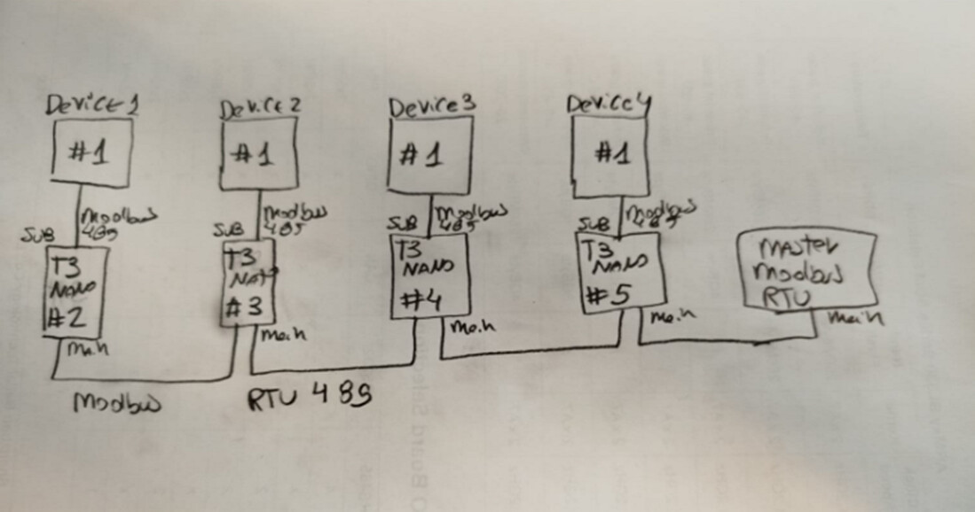 Read from Slave: Each T3-Nano would be configured to read data from its dedicated Modbus RTU slave device (which is hard-coded to address 1) connected to its “SUB” port.