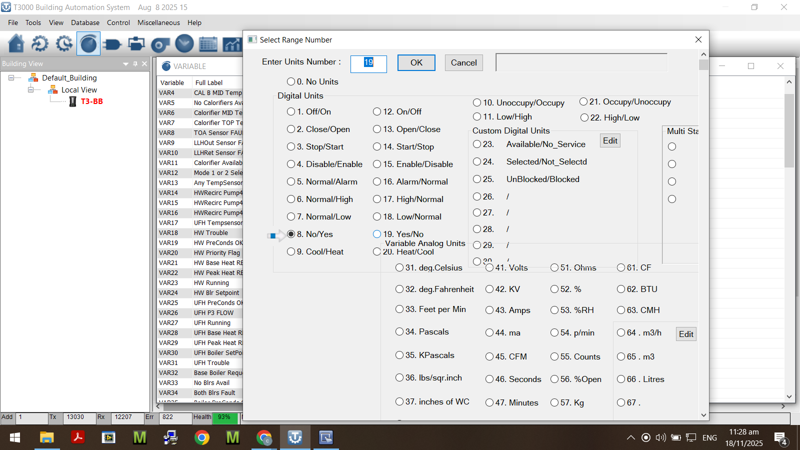 There is definitely a bug in T3000 regarding setting of Units (Range) for variables. When setting Units, the pop-up includes a “default” option - with arrow and radio button pre-selected (see screenshot).