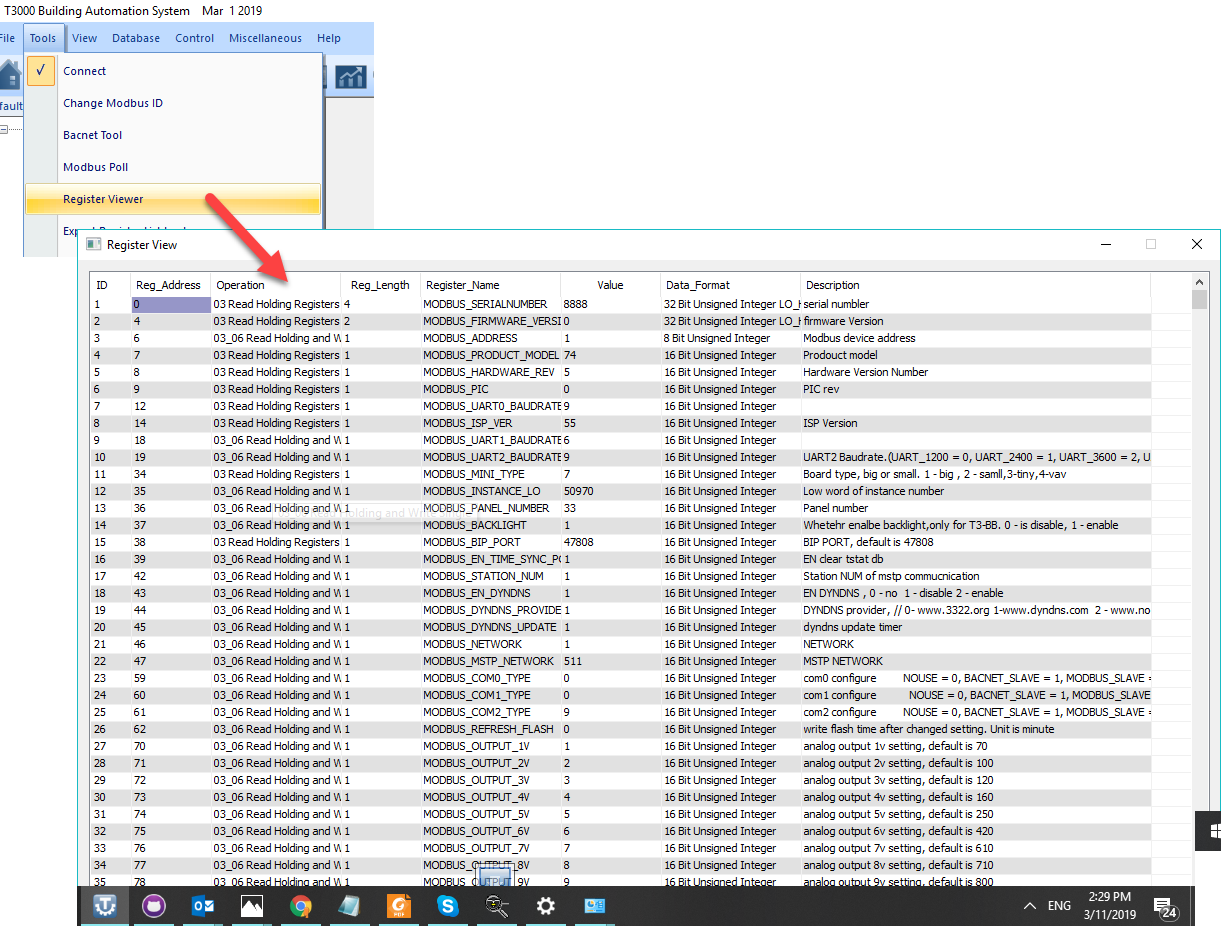 As I mentioned before, if you are doing a lot of work with Modbus registers you will want to get familiar with the T3000 → Tools → Modbus register viewer.