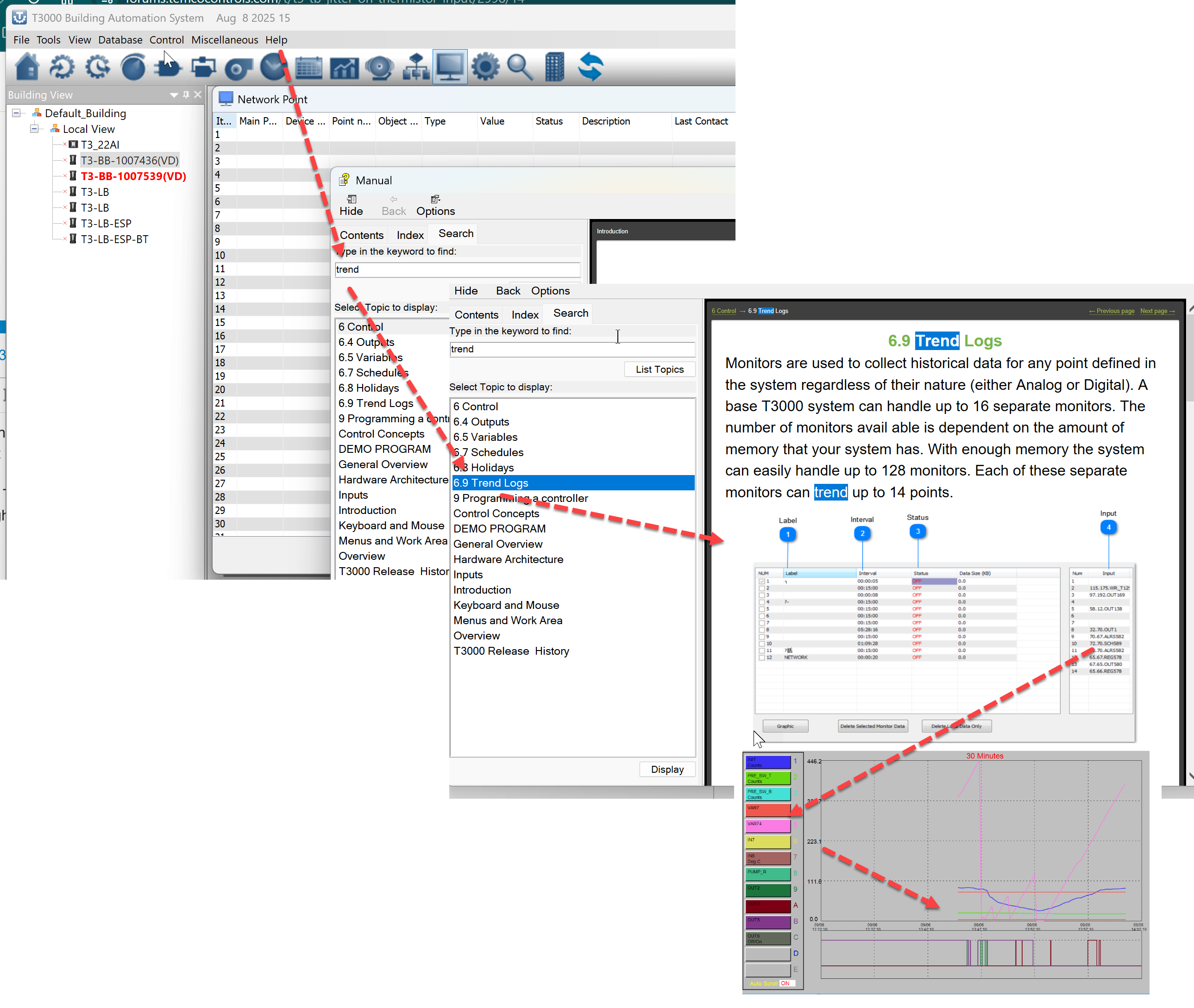 Trend Logs: I would update the T3000 application for starters, the one you are showing is the original trend log system. While you are at it update the T3 controller firmware, its in the same dialog box.
