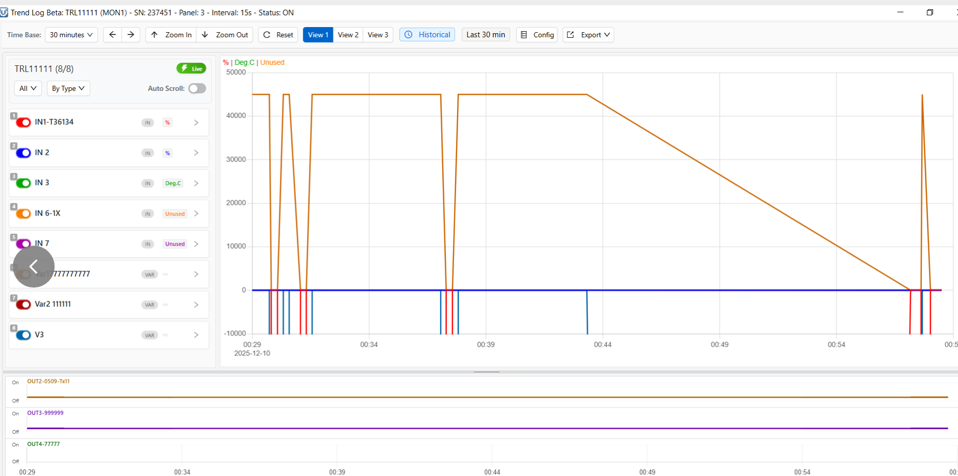 Graphing: type in the input, output, variable name here. You can use the 8 char label or the direct 1IN1 reference method. Panel number first, it can be any panel in the system, then the object reference like in, out or var.
