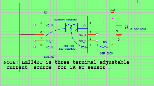 The 68R (Rset) resistor means the LM334 sources nominally 1mA current into the Pt1000 sensors. However this is dependent on Rset tolerance (1%) and also the fact the LM334 output varies with its (junction) temperature. (Another use of LM334’s is as a temperature sensor - similar to LM335.) This will cause some discrepancy in combination with the Pt1000 response.