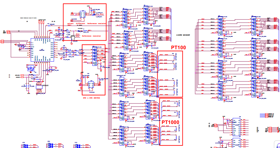 We use a constant current excitation into the Pt1000. The measurement is done with the STM32 internal ADC, using a 3.0 V reference. The excitation current is set with an LM334, with a 68 ohm resistor (1% tolerance). All Pt1000 channels share the same current source and are sampled by the same ADC through channel multiplexing.