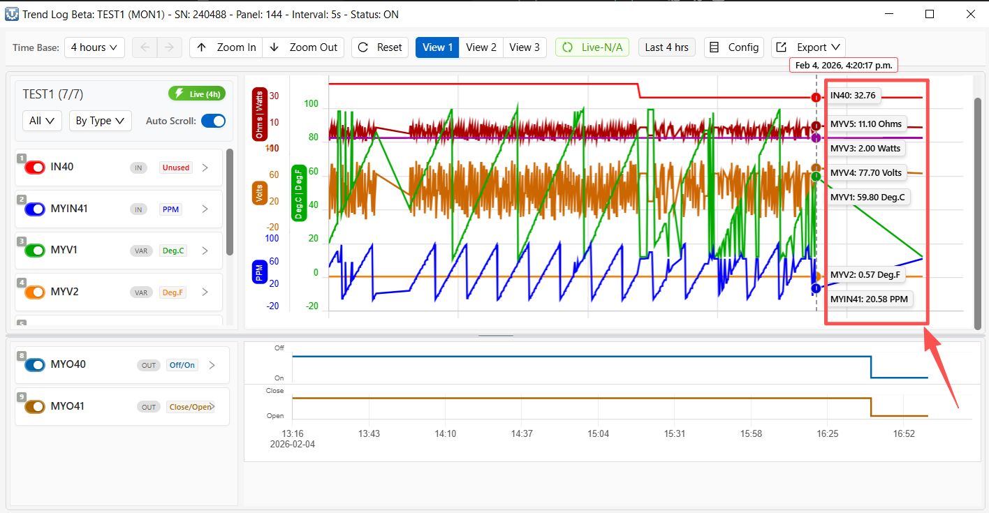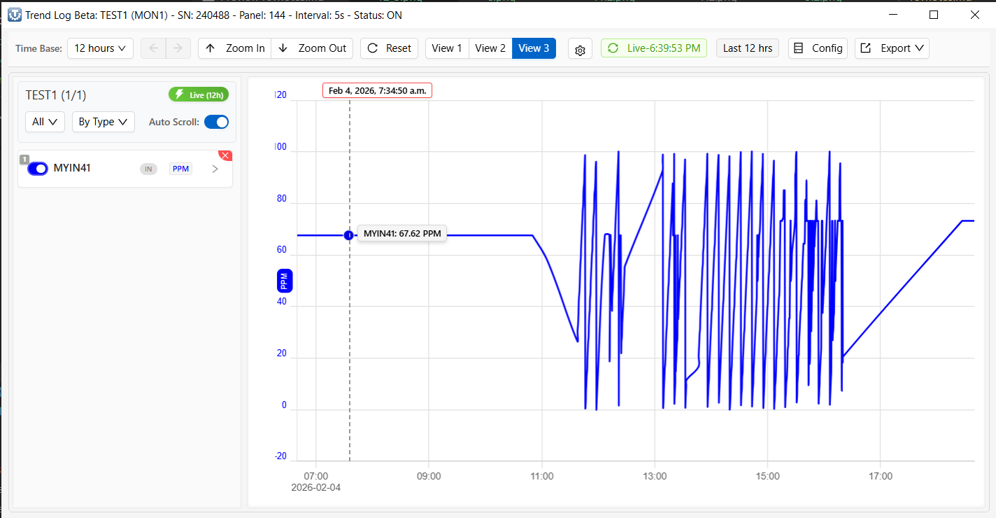 The Trend Log function is designed to periodically sample and record historical data from inputs (IN), outputs (OUT), and internal variables (VAR) of T3 series controllers. It provides both real-time trend visualization and historical data playback, and is widely used for system commissioning, performance analysis, and fault diagnostics.
