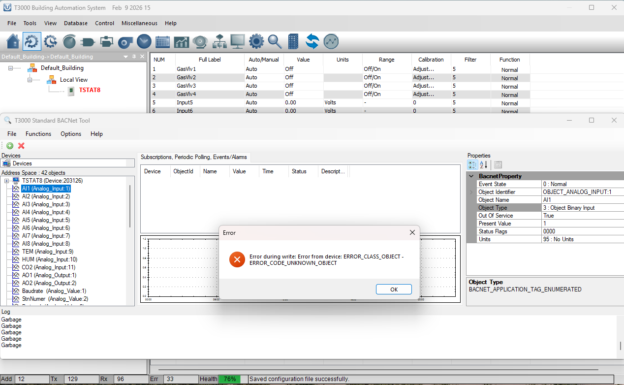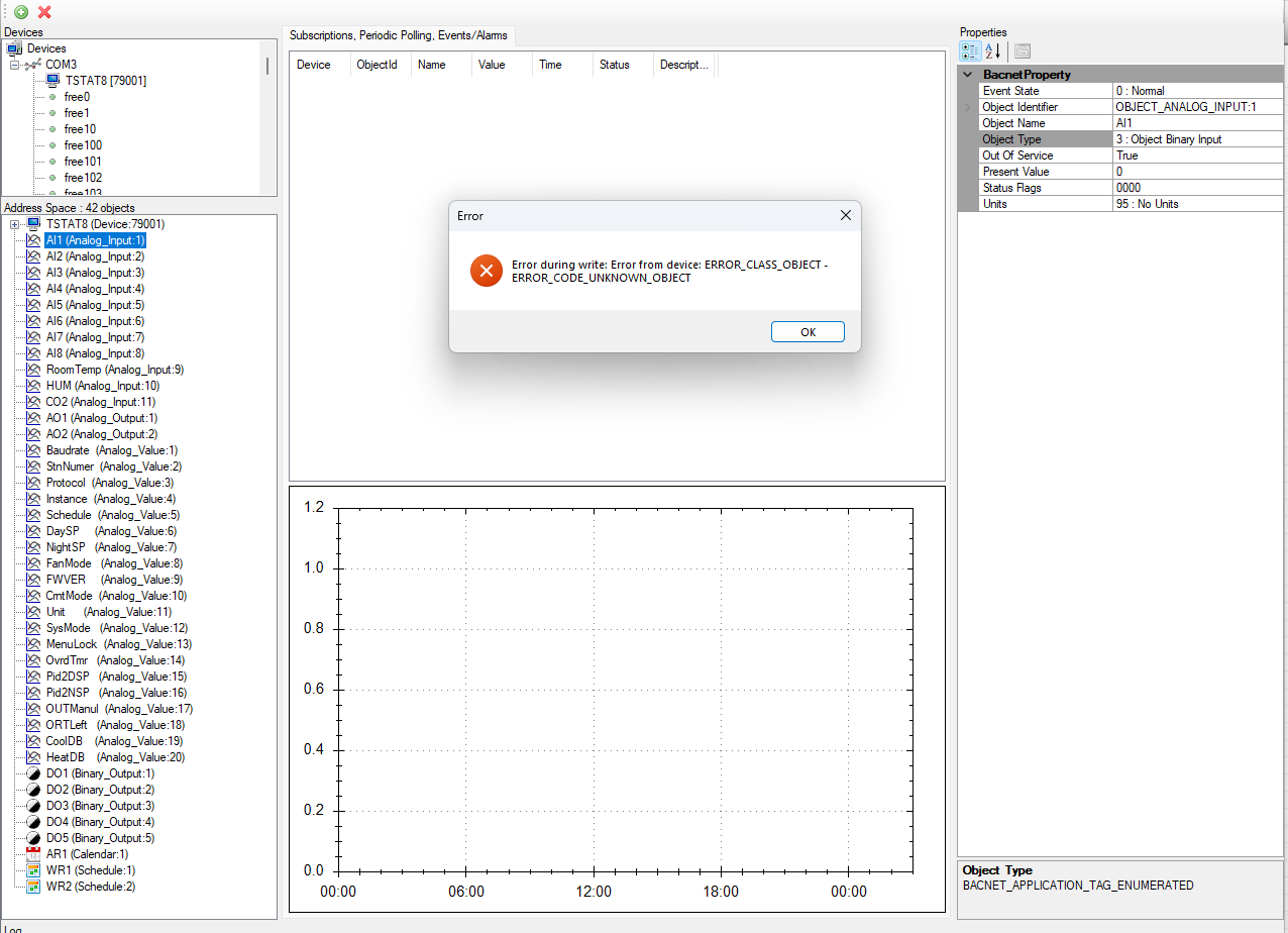 I am having a problem in changing an input of the Tstat8 from analog to binary. I am using the T3000 with the latest software updates and also updated the firmware in the Tstat8. When I select i.e. AI1 and in the “Bacnet Property” select Object type (which gives several selections), I want to change from 0:Object Analog Input to 3:Object Binary Input. When I do, I get an error: Error during write: Error from device: ERROR_CODE_UNKNOWN_OBJECT. Any thoughts in what I am doing wrong? Thank you.