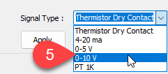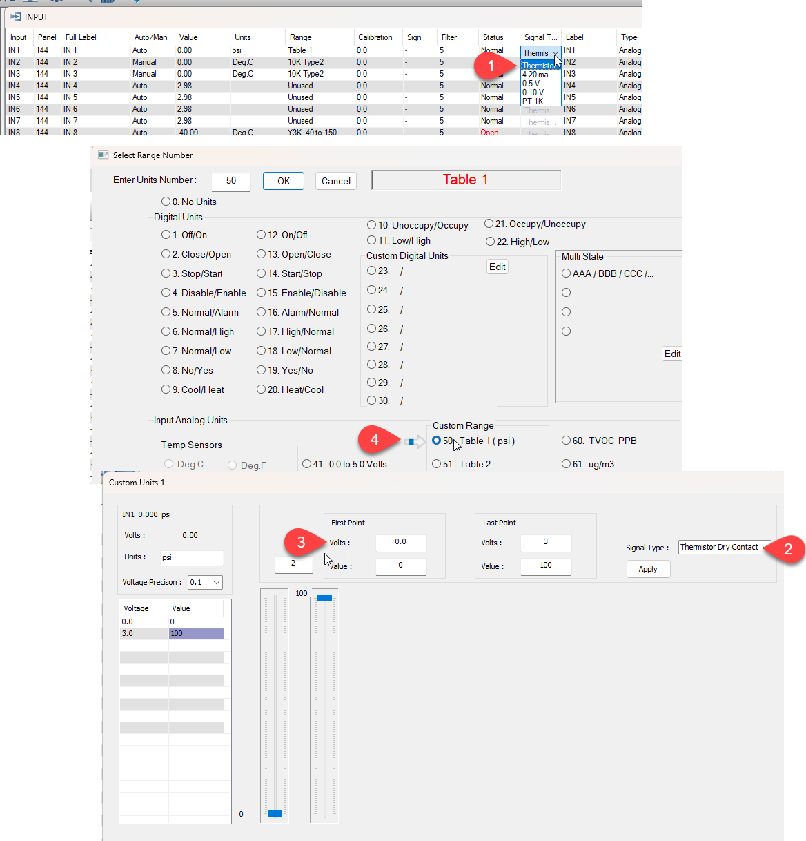 This brings up the custom range dialog where you can fill in the range for the potentiometer. The T3 controller uses an excitation voltage of 3V which is connected through a 10k pullup resistor for reading thermistors and dry contacts. This means we should see the voltage on the input swing from 0V to 1.5V when the pot goes through its full range of motion from 0 ohms to 10k ohms. We fill in these expected voltages at Tab4 and the corresponding min/max setpoints we want at Tab8. We’re using a linear pot so we only need two data points in our custom table. Be sure to select thermistor/dry contact as the signal type at Tab1.
